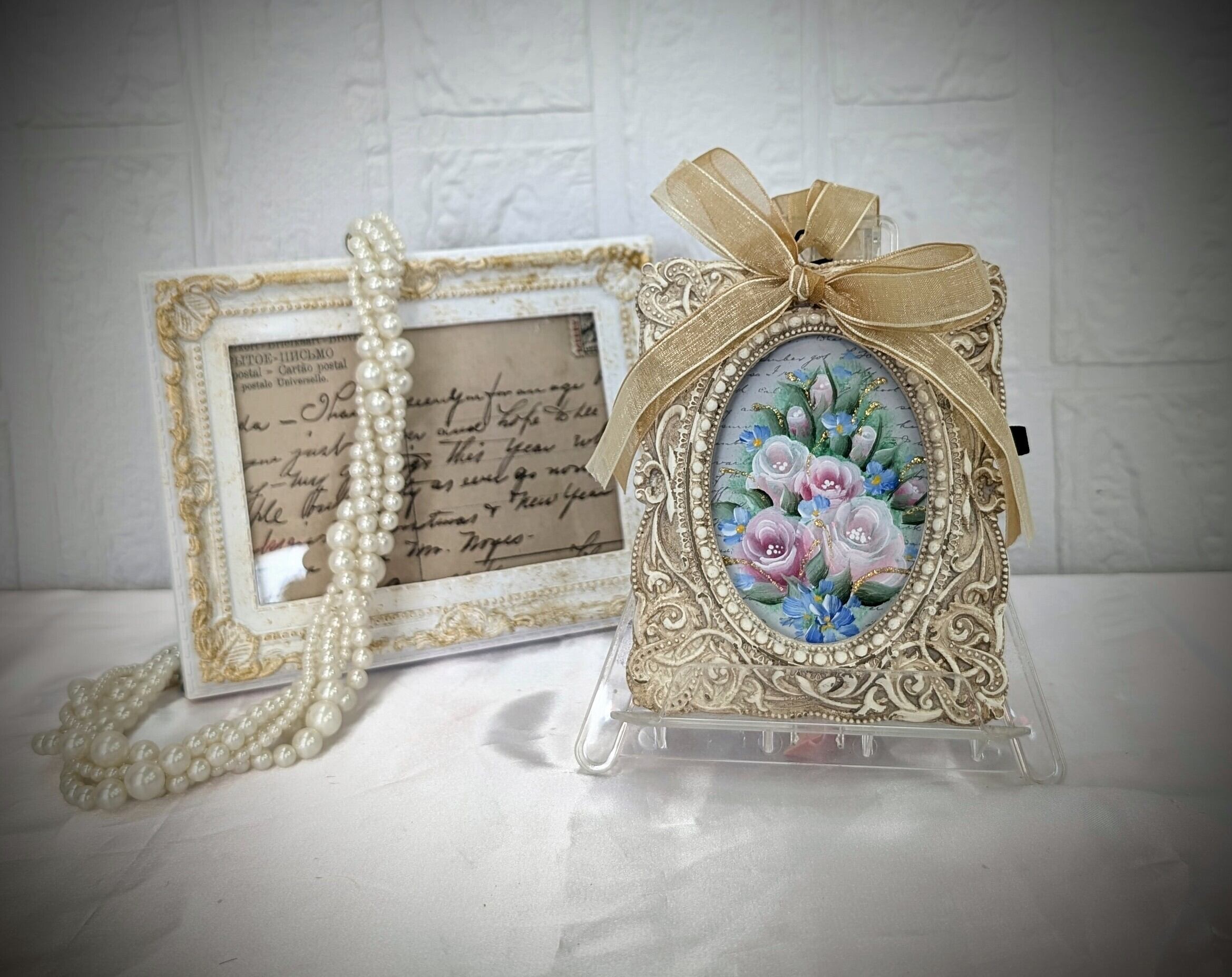 細かな装飾が施されたアンティークミニ額の絵。手作りの温かみを感じるデザインは、お部屋のインテリアに一味違った雰囲気をプラスしてくれます。小さな額ながらも、繊細な彫刻や金箔のアクセントで、上質な雰囲気を演出します。